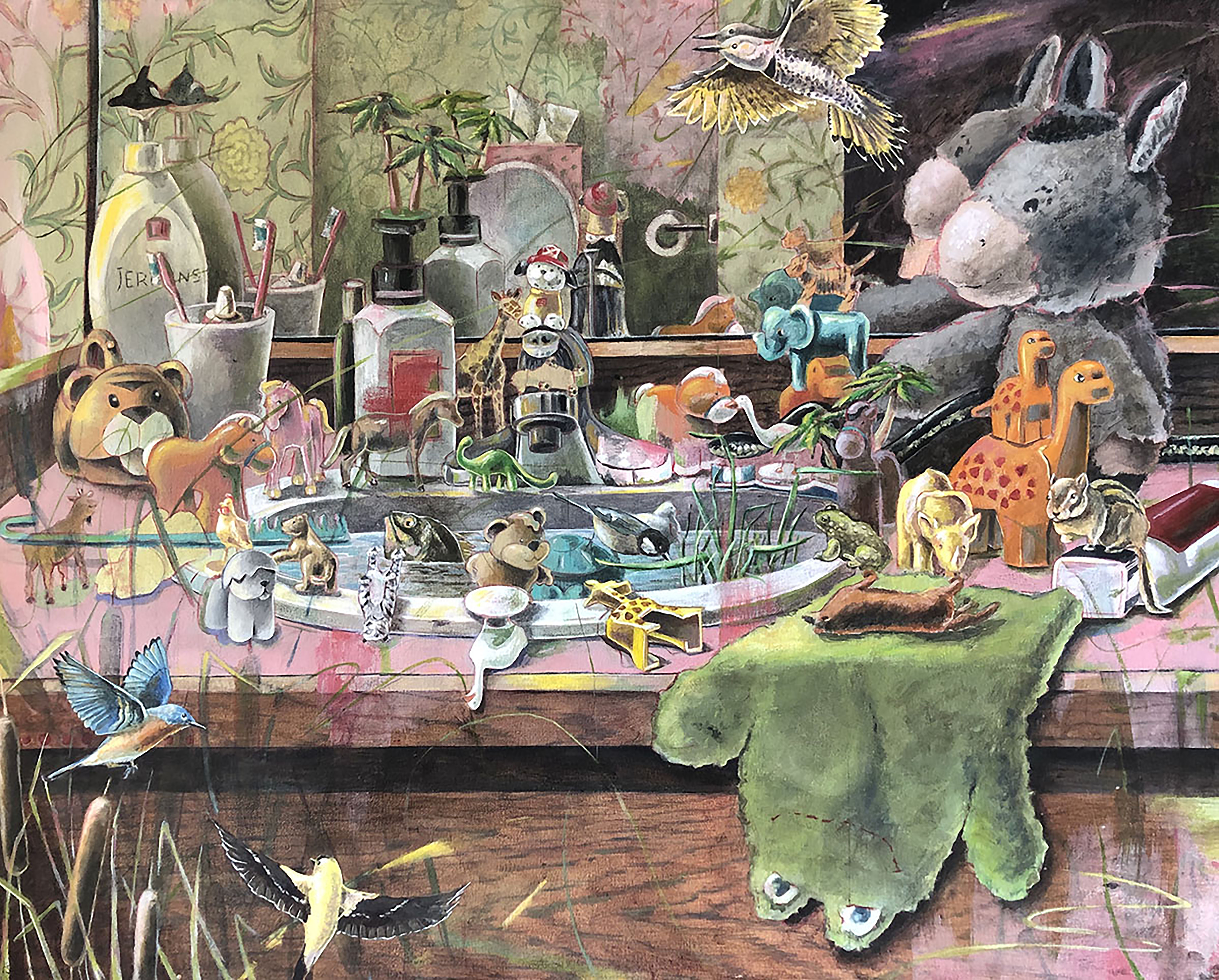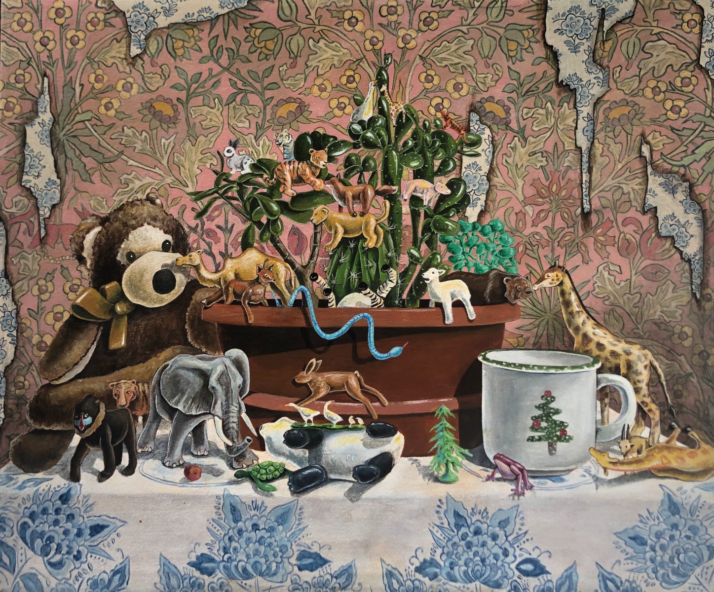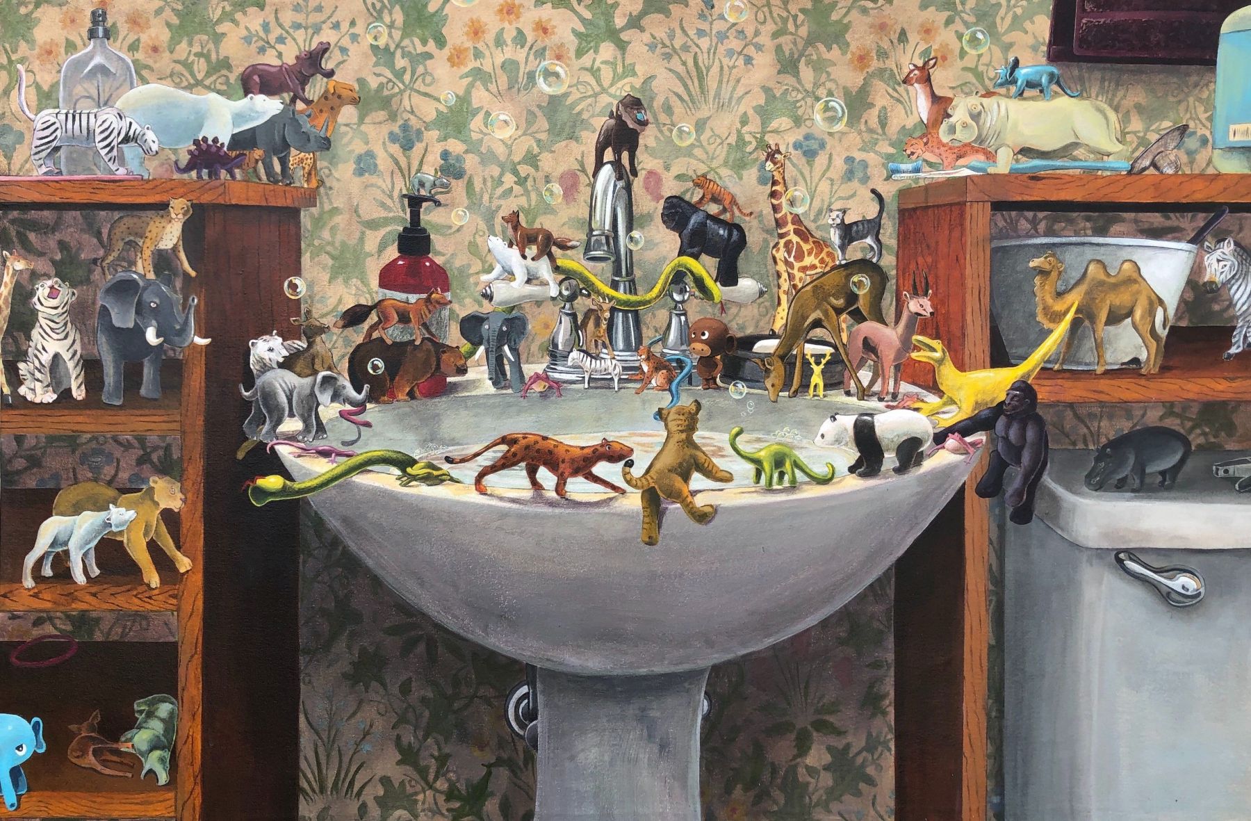 While artificial representations are on the rise, ecosystems are disturbed by human impact, and biodiversity is dwindling. Ironically, as we long for a wildness that is less and less present in our daily lives, we replace it artificially in our homes. Fake plants in kitchens, giraffe patterned curtains in our living rooms, safari animal decals in our nurseries, stuffed animals in our bedrooms, and televisions roaring with animal life documentaries all create a false representation of “wild.” Clearly, humans value nature and animals, but humans have lost touch with true experiences of the wilderness.